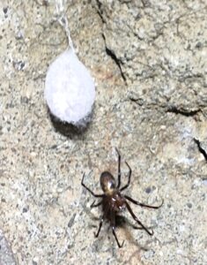 Barlangi keresztespók (Meta menardi) és beszőtt zsákmánya