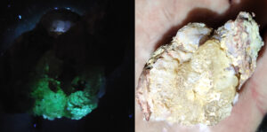 Hialit, más néven üvegopál (SiO2*nH2O) UV-fényben és természetes fényben
