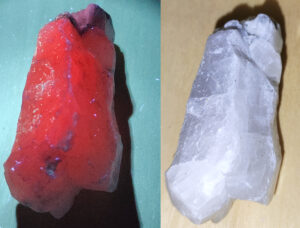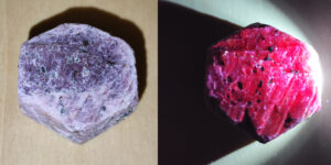 Korund (Al2O3) természetes fényben és UV-fényben